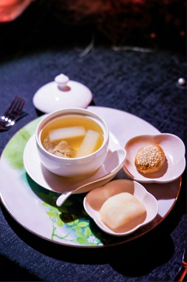 拾久 Poetry & Wine 与茉 MO•Jasmine 创始人张芊(两品牌均荣获米其林一星),以东坡嗜羊之趣为脉络,呈献「温露润玉酥」。取清炖羊肉之本味,辅以当归、黄芪、桂圆温润提气,汤澄味醇;同席\"东坡饼\"承其所赞环饼之酥与艳,再配以\"呛腌莱阳秋月梨\"添凉添甘。一汤一饼一清口,清醇、酥香、甘润交织,尽显东坡式丰味与雅致。