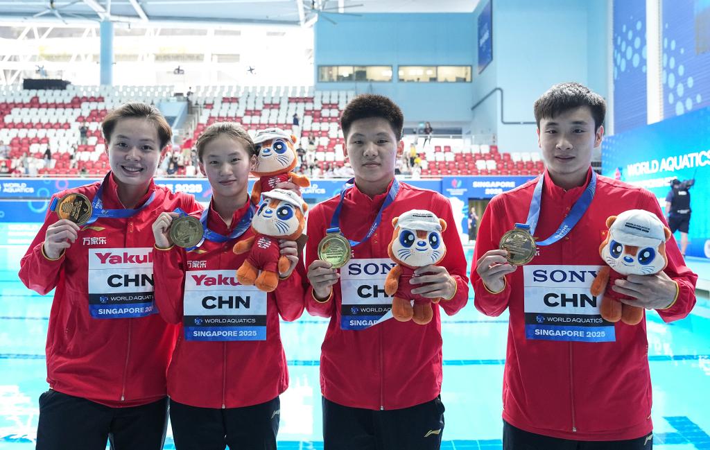 新华社新加坡7月26日电(记者夏亮、李嘉)26日,2025年游泳世锦赛跳水项目迎来首个比赛日。由陈艺文、陈芋汐、曹缘、程子龙组成的中国队在混合团体比赛中以39.95分的领先优势夺得项目首金安信,墨西哥和日本队分获银牌和铜牌。