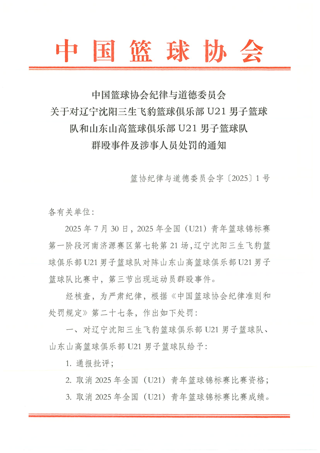 通知称,2025年7月30日,2025年全国(U21)青年篮球锦标赛第一阶段河南济源赛区第七轮第21场,辽宁沈阳三生飞豹篮球俱乐部U21男子篮球队对阵山东山高篮球俱乐部U21男子篮球队比赛中,第三节出现运动员群殴事件。