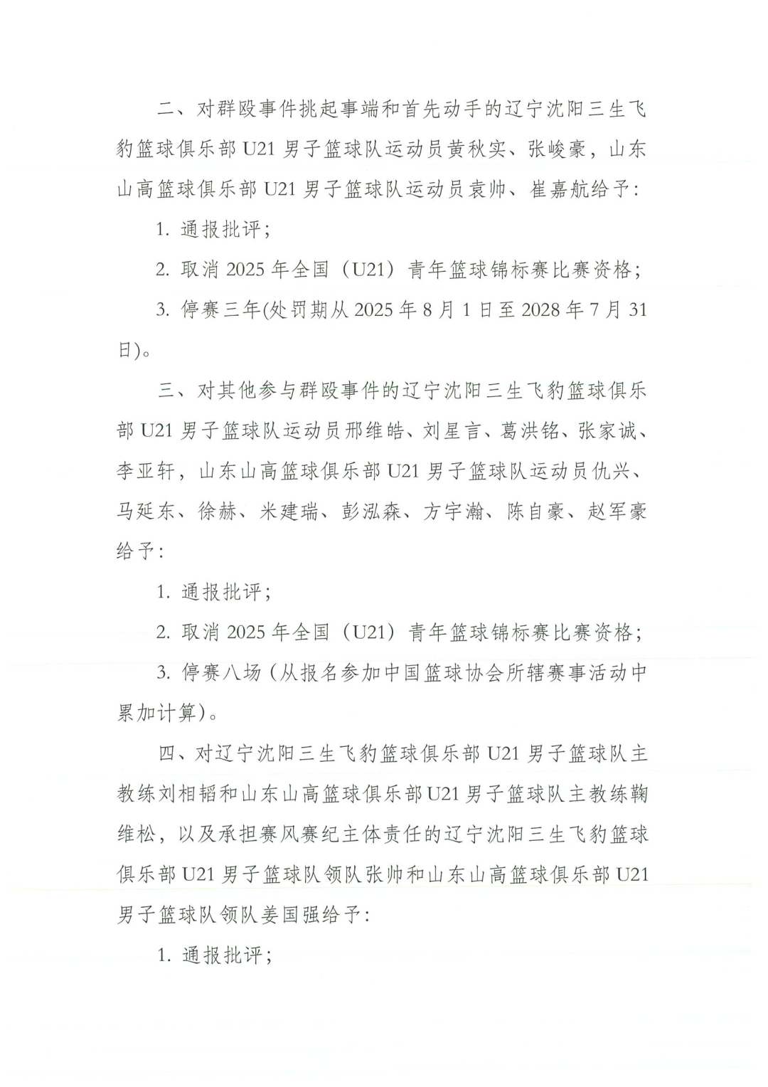 对群殴事件挑起事端和首先动手的黄秋实、张峻豪(辽宁)、袁帅、崔嘉航(山东)给予取消2025年全国(U21)青年篮球锦标赛比赛资格,停赛三年。