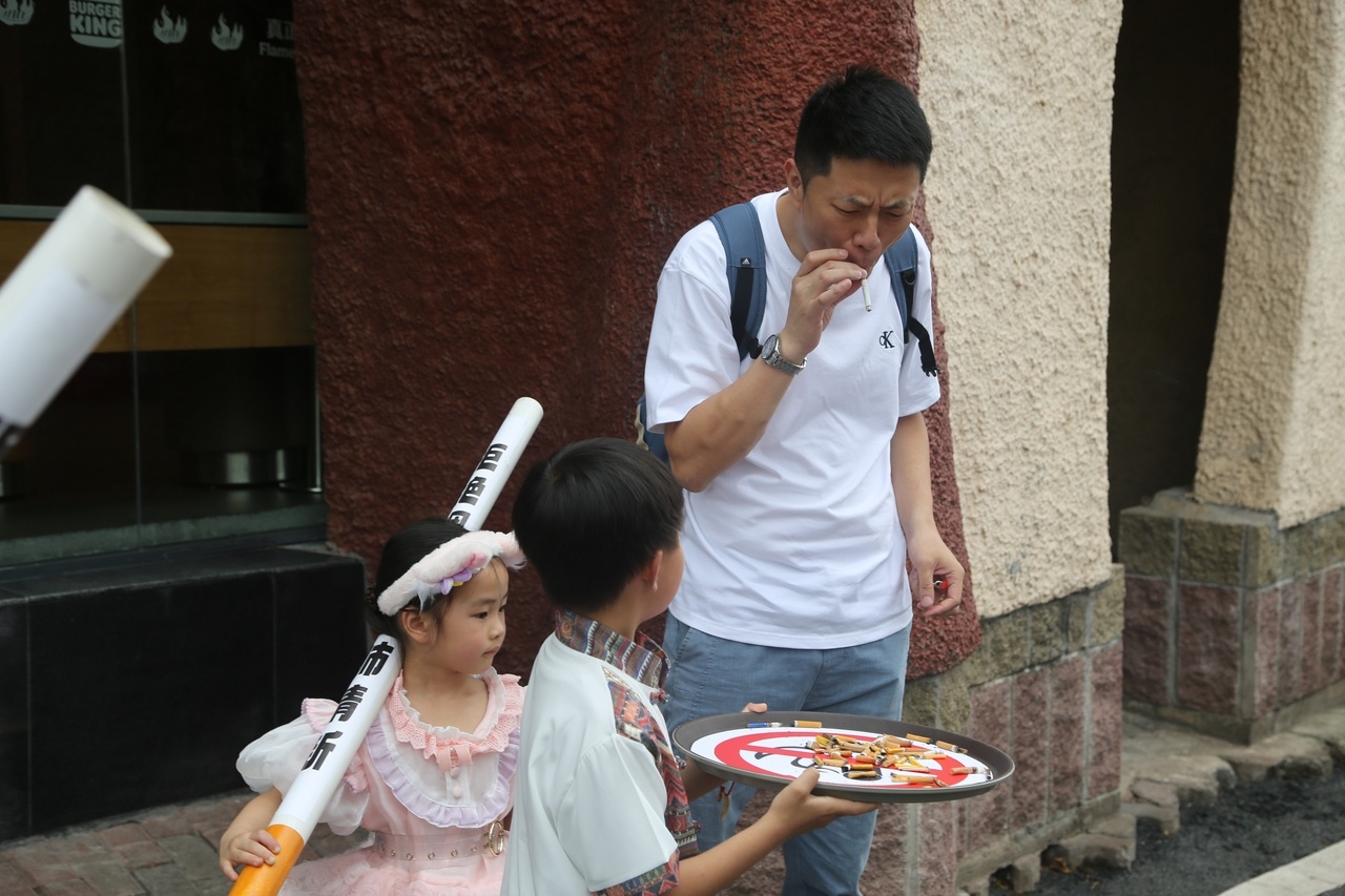 活动现场,儿童志愿者们手持写有“用我棒棒糖,换您不抽烟”和“用我馒头,换您烟头”的劝烟牌,笑容满面地穿梭在人群中。景区工作人员则抬着景区1元网红大馒头,托着一盘盘色彩鲜艳的棒棒糖,紧跟其后。他们的身影出现在景区游客中心、鸡公山乐园、好吃街及三块钱乐园等儿童聚集较多的地方。