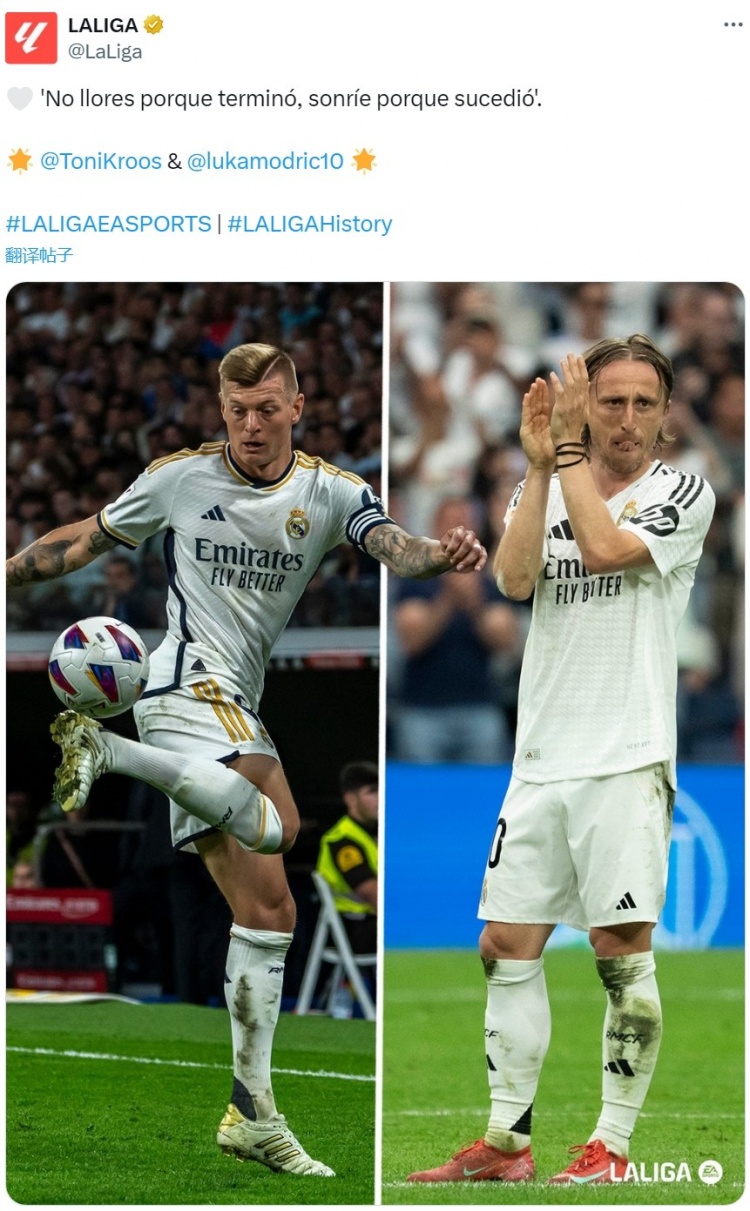 西甲官方社媒晒出克罗斯和莫德里奇效力皇马时期的照片,配文:“不要因为它结束了而哭泣,要因为它发生过而微笑。”